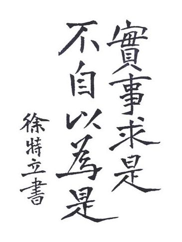 “實事求是,不自以為是”是老院長徐特立的思想。1942年4月1日,徐特立在擔任我校前身——自然科學院院長期間,組織開展了為期9個月的教育方針大討論,并在《解放日報》上發表了《再論我們怎樣學習》一文,提出了“實事求是”,不要“自以為是”的思想。1949年10月,徐特立為《河北教育》創刊號題寫了“實事求是,不自以為是”九個字,并說明這是學風中最重要的。