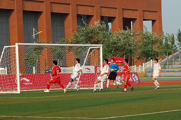 下半場開始后20分鐘過后,雙方在場上展開了一場驚心動魄的進球大戰。首先是我方11號前鋒王強在第23分鐘時利用角球的機會頭球攻門,皮球射入左門柱附近死角,守門員雖盡力撲救,但無奈鞭長莫及。場上比分變為2:0。