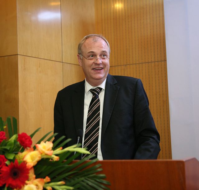 戴姆勒中國卡車公司總裁兼首席執行官Gerrit Marx博士致辭。他首先歡迎大家出席典禮,Gerrit Marx博士的致辭,對 “合規性與公司治理”高級工商管理碩士班的創辦與發展給予了高度評價,指出學校與企業合作是學校企業共同發展的需要。Gerrit Marx博士說:“貴校與德國兩所大學合作為戴姆勒公司舉辦EMBA班項目,是把全球最佳實踐融入一個定制項目之中,從而滿足在中國成功進行商業活動的需求。第四期學員順利開學,說明了中國已是全球經濟增長最快的國家,中國的經濟發展給教育的優化整合帶來了新的教育市場,校企強強聯合互利雙贏具有重要的現實意義和戰略意義,我們為支持這個項目而感到非常自豪。”