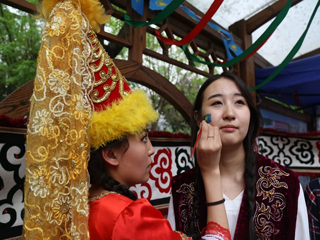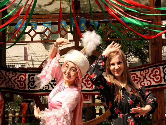 身著民族服裝的哈薩克斯坦姑娘正在教觀眾跳舞
