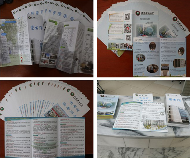 今年圖書館全新改版了原有的《讀者指南》內容,重新設計、印制了包括《北京理工大學圖書館》、《圖書館-讀者須知》、《圖書館攻略-設備篇》等三種在內容上各有側重、又相互關聯的宣傳折頁。全面向讀者介紹了中關村校區和良鄉校區圖書館的布局、資源及服務,便于讀者走出空間和校區限制,充分利用兩個校區圖書館。在學生事務中心的協助下,將9000余份宣傳資料提前放入了每位新生的入學資料袋中,以確保每位新同學在進入校門的第一時間認識圖書館。