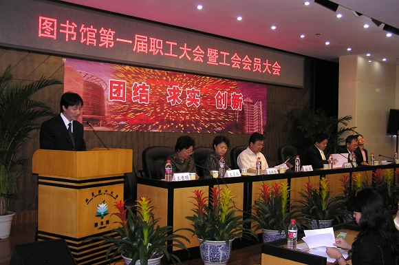 各位與會代表本著高度負責的態度和精益求精的精神,全面審議了圖書館館長張永發做的題為《團結起來,為建設國內一流的高校圖書館而努力奮斗》的圖書館工作報告,審議了圖書館工會工作報告,討論通過了《文明服務公約》。