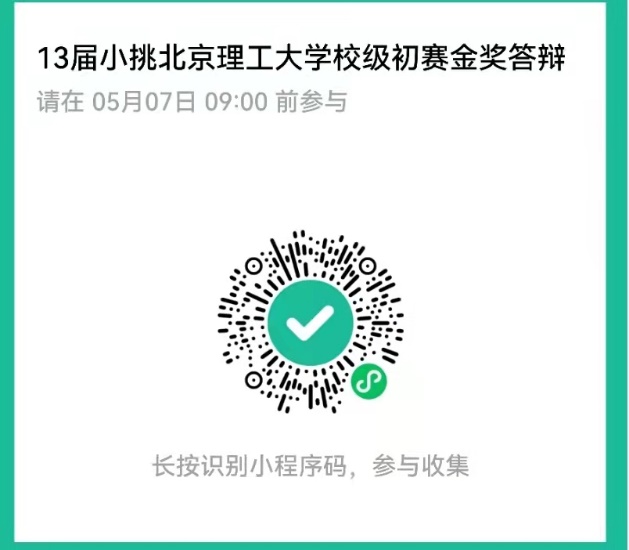 2、參賽信息報送。5月7日9時前,各入圍答辯的項目通過掃描小程序報送聯(lián)絡(luò)人信息,請?zhí)崆?/span>確認(rèn)好項目編號、答辯場次、項目負(fù)責(zé)人(須與公示名單一致)及負(fù)責(zé)人手機(jī)號碼、項目聯(lián)絡(luò)人及聯(lián)絡(luò)人手機(jī)號等信息。