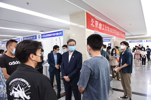 招聘會現場,校黨委書記張軍院士、副校長龐思平帶隊,與參會單位進行親切交流,介紹學校人才培養優勢和專業特色,了解單位吸納北理工學生就業實習情況和春招工作進展,并與在場學生進行溝通,詢問求職意向及應聘情況。