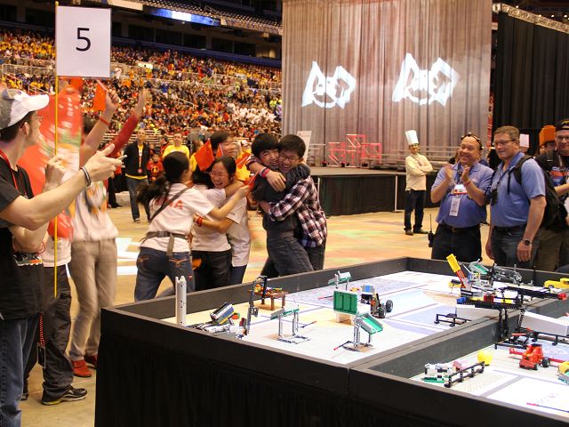 冠軍!中國選手和教練員們在賽場上歡呼著,跳躍著,擁抱著,淚水不知不覺從臉頰上留了下來,附小機器人代表隊獲得中國代表隊參加FLL世界機器人冠軍賽以來最好的成績。