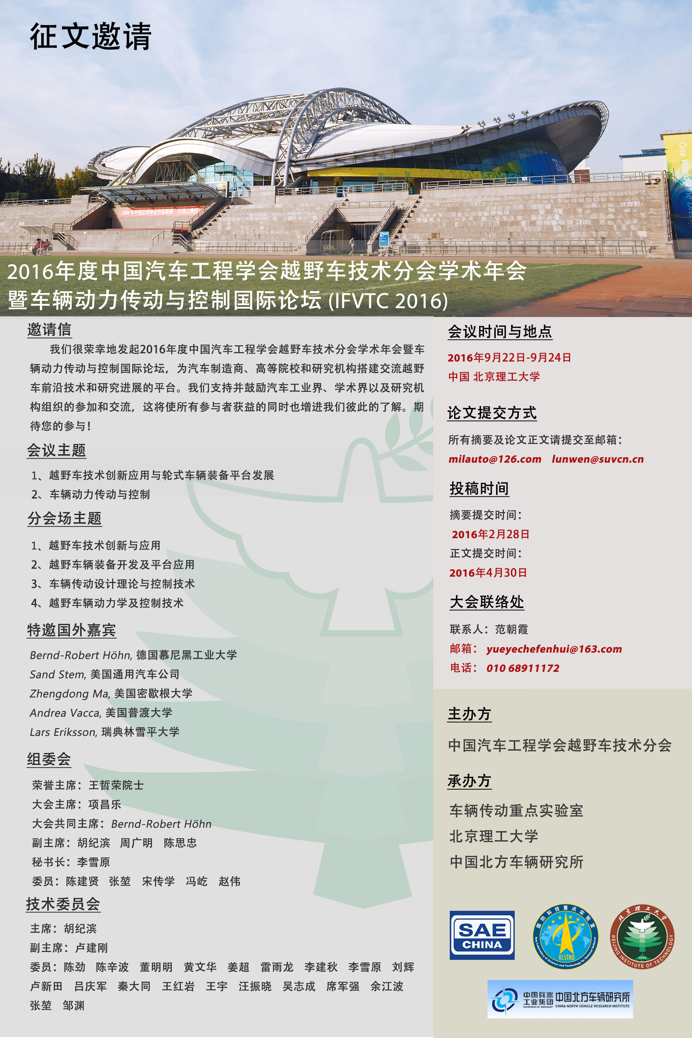 由中國汽車工程學會越野車技術分會主辦,車輛傳動重點實驗室、北京理工大學、中國北方車輛研究所承辦的“2016中國汽車工程學會越野車技術分會學術年會暨車輛動力傳動與控制國際論壇”將于2016年9月22-24日在中國?北京舉辦。本次活動將采取主旨報告、專題論壇、分論壇交流、車輛裝備展示和實地參觀考察等形式進行。現就此次活動安排及征文有關事宜通知如下: