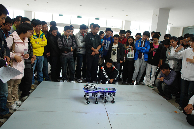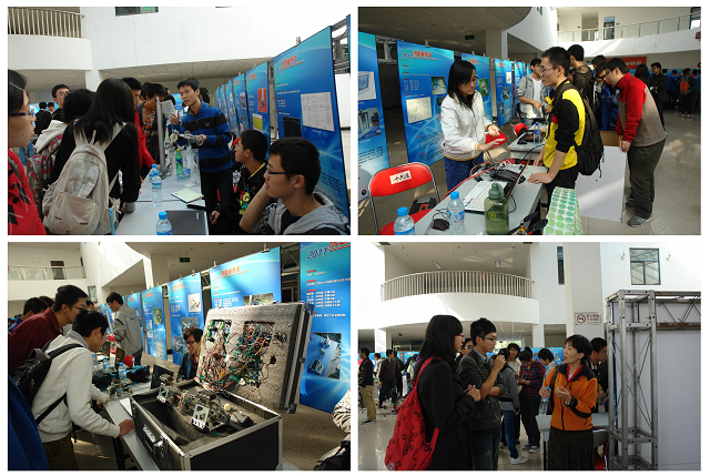 10月15日,在良鄉校區學生服務中心,舉行了2011年優秀大學生科技創新作品展。參展作品主要是各級各類學科知識競賽、國家級與校級大學生創新項目優秀作品,包括全國大學生電子設計競賽、信息安全競賽、數學建模競賽、機械設計大賽、"挑戰杯"、智能車大賽、節能車大賽、機器人大賽、工程訓練綜合能力大賽、計算機博弈錦標賽等賽事獲獎作品及第四屆大學生創新論壇入選作品。在現場,高年級的同學將自己制作的作品進行實物展示,并為前來參觀的同學熱情講解,講述他們創作的靈感和思路,創作過程中的艱辛和喜悅。展示會中的優秀作品及團隊成員,為低年級學生樹立了榜樣和目標,讓其知道"他們能做"、"不僅能做、還能做得很好"。