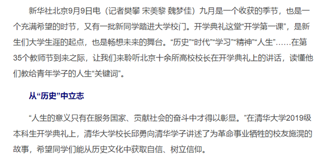 九月是一個收獲的季節,也是一個充滿希望的時節,又有一批新同學踏進大學校門。開學典禮這堂“開學第一課”,是新生們大學生涯的起點,也是暢想未來的舞臺?!皻v史”“時代”“學習”“精神”“人生”……在第35個教師節到來之際,讓我們來聆聽北京十余所高校校長在開學典禮上的講話,讀懂他們教給青年學子的人生“關鍵詞”。