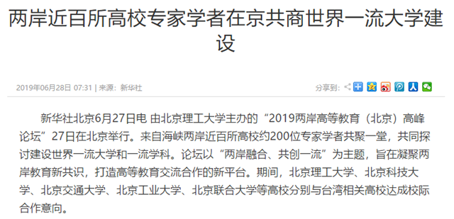 由北京理工大學主辦的“2019兩岸高等教育(北京)高峰論壇”27日在北京舉行。來自海峽兩岸近百所高校約200位專家學者共聚一堂,共同探討建設世界一流大學和一流學科。論壇以“兩岸融合、共創一流”為主題,旨在凝聚兩岸教育新共識,打造高等教育交流合作的新平臺。期間,北京理工大學、北京科技大學、北京交通大學、北京工業大學、北京聯合大學等高校分別與臺灣相關高校達成校際合作意向。