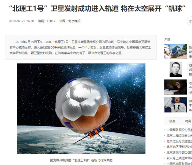 編輯:吳楠 審核:王征 閱讀次數:原文標題:“北理工1號”衛星發射成功進入軌道 將在太空展開“帆球”