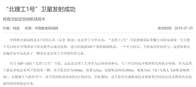 北京理工大學宣布:“北理工1號”衛星搭乘星際榮耀公司的雙曲線一號火箭今天13時在中國酒泉衛星發射中心成功發射,進入距地面300千米的地球軌道。一個半小時后,衛星成功傳回信號。這意味著在浩瀚宇宙中從此有了一顆來自北京理工大學的科學之星。