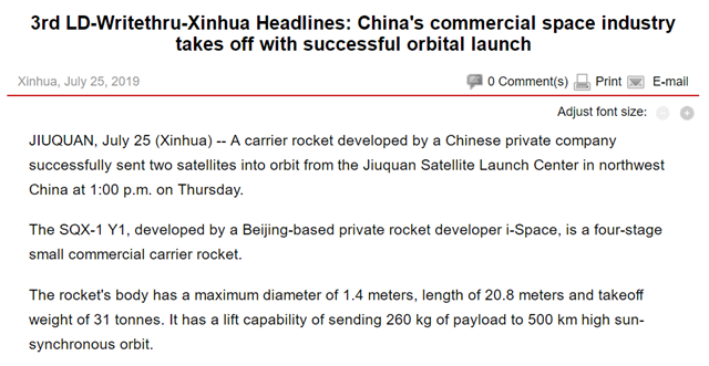 原文標(biāo)題:3rd LD-Writethru-Xinhua Headlines: China's commercial space industry takes off with successful orbital launch