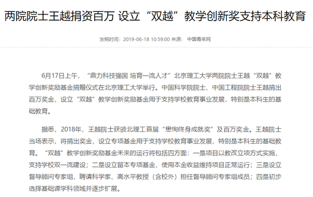 據(jù)悉,2018年,王越院士獲頒北理工首屆“懋恂終身成就獎(jiǎng)”及百萬(wàn)獎(jiǎng)金。王越院士當(dāng)場(chǎng)表示,將捐出獎(jiǎng)金,設(shè)立專項(xiàng)基金用于支持學(xué)校教育事業(yè)發(fā)展,特別是本科生的基礎(chǔ)教育。“雙越”教學(xué)創(chuàng)新獎(jiǎng)勵(lì)基金未來(lái)的運(yùn)行將包括四方面:一是項(xiàng)目以教改立項(xiàng)方式實(shí)施,支持學(xué)校雙一流建設(shè);二是設(shè)立留本專項(xiàng)基金,使用本金收益維持項(xiàng)目正常運(yùn)行;三是設(shè)立督導(dǎo)顧問(wèn)專家組,聘請(qǐng)科學(xué)家、高水平教授(含校外)擔(dān)任督導(dǎo)顧問(wèn)專家組成員;四是初步選擇基礎(chǔ)課學(xué)科領(lǐng)域并逐步擴(kuò)展。