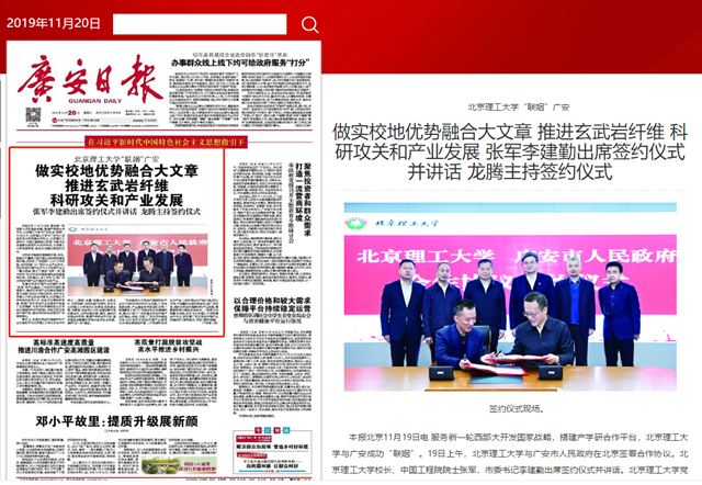 李建勤表示,在國家政策的支持下,充分發(fā)揮廣安小平故里和緊鄰重慶的優(yōu)勢,廣安發(fā)展前景必將更加美好。在下一步工作中,希望雙方以這次簽訂的合作協(xié)議為起點,依托北京理工大學的人才優(yōu)勢、技術優(yōu)勢,支持廣安推進玄武巖纖維產(chǎn)業(yè)科研實現(xiàn)新突破和產(chǎn)業(yè)大發(fā)展,推動合作取得實質(zhì)性進展,共同實現(xiàn)好小平同志“一定要把廣安建設好”的囑托。希望北京理工大學派出工作小分隊到廣安考察、調(diào)研,尋找科研與生產(chǎn)的最佳結(jié)合點,并派出干部到廣安掛職,幫助廣安推進玄武巖纖維產(chǎn)業(yè)科研攻關和產(chǎn)業(yè)發(fā)展。