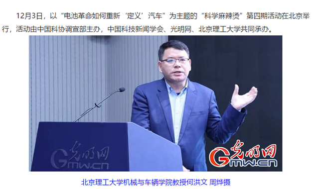 12月3日,以“電池革命如何重新‘定義’汽車”為主題的“科學(xué)麻辣燙”第四期活動在北京舉行,活動由中國科協(xié)調(diào)宣部主辦,中國科技新聞學(xué)會、光明網(wǎng)、北京理工大學(xué)共同承辦。