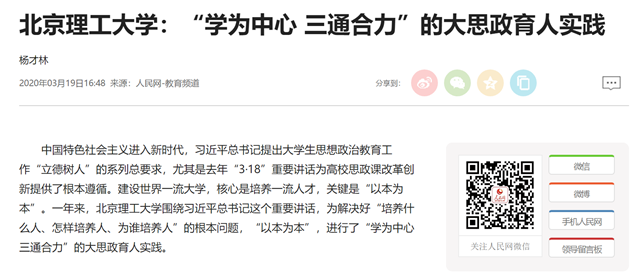編輯:吳楠 審核:劉曉俏 閱讀次數:原文標題:北京理工大學:“學為中心 三通合力”的大思政育人實踐