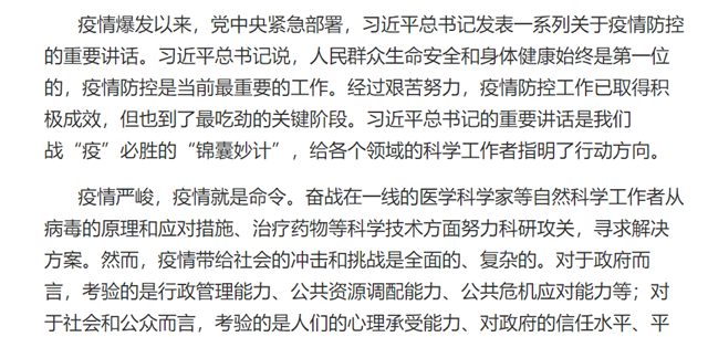 疫情爆發(fā)以來,黨中央緊急部署,習(xí)近平總書記發(fā)表一系列關(guān)于疫情防控的重要講話。習(xí)近平總書記說,人民群眾生命安全和身體健康始終是第一位的,疫情防控是當(dāng)前最重要的工作。經(jīng)過艱苦努力,疫情防控工作已取得積極成效,但也到了最吃勁的關(guān)鍵階段。習(xí)近平總書記的重要講話是我們戰(zhàn)“疫”必勝的“錦囊妙計(jì)”,給各個(gè)領(lǐng)域的科學(xué)工作者指明了行動(dòng)方向。