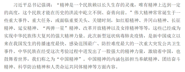 習近平總書記強調:“精神是一個民族賴以長久生存的靈魂,唯有精神上達到一定的高度,這個民族才能在歷史的洪流中屹立不倒、奮勇向前?!眰ゴ缶癯3UQ生于一些重大事件、重大任務,或面臨重要關頭、關鍵時刻,如紅船精神、井岡山精神、長征精神、延安精神、“兩彈一星”精神、改革開放精神以及女排精神等等,這些已經成為實現中華民族偉大復興的強大精神力量。此次新型冠狀病毒肺炎疫情,是新中國成立以來在我國發生的傳播速度最快、感染范圍最廣、防控難度最大的一次重大突發公共衛生事件。中華民族在經受這次考驗過程中迸發出了一股強大的精神力量,激勵著中國,也鼓舞著世界,我們稱之為“中國精神”。中國精神的內涵包括擔當奉獻精神、團結奮斗精神、科學防治精神和人類命運共同體精神等方面內容。