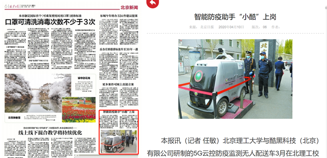 北京理工大學與酷黑科技(北京)有限公司研制的5G云控防疫監測無人配送車3月在北理工校園上崗,運行一個月以來,效果良好。“小酷”不僅能對一人或者多人秒測體溫,同時可報警并獨立配送物資。它還能移動監測體溫,發現異常實時“喊話”,可用于復學后的校園疫情防控。