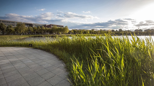 良鄉校區建設不僅用基礎設施建設為學生提供了較好的學習生活保障,還充分發揮新校區地緣優勢,在校園環境建設中“善弄粉彩”,既有可圈可點的“神來之筆”,也著眼于大空間、大布局,疏密有致,通透流暢。良鄉校區51.41%的高綠化率,使之成為當之無愧的園林校區。當下,良鄉校區有喬木12,147株,灌木22,940株,攀緣植物432株,叢簇植物12,920株,色帶有8,000多平米,這其中花卉面積1萬多平米,野花5萬多平米,野草10萬多平米,總綠化面積達318,467平米。