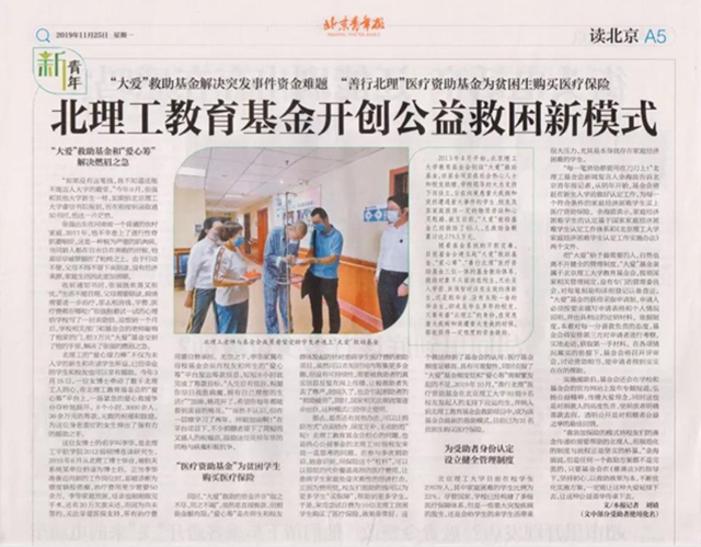 那么,是否還有其他辦法,可以讓捐助方式“點面結合、深度互補、主動防范”呢?北理工教育基金會擔心的問題,也是熱心公益事業的北理工92級校友宋競一直思考的問題。在參與多次捐助后,她意識到,用保險這個“杠桿”,可以以很低的代價覆蓋高昂的醫療費用,讓患病學生家庭免受災難性的經濟打擊,正因為費用低,校友們捐助的錢可以為更多學生“買保障”,幫助到更多學生。于是,宋競嘗試自費為10位北理工貧困學生購買了醫療保險,效果非常好。這個做法得到了基金會的認可:醫療基金額度足夠高、具有可重復性,同時克服了“大愛”基金額度低和“愛心籌”需頻繁發起的不足,2019年10月,“善行北理”醫療資助基金在北京理工大學92級9名校友發起人的支持下應運而生,并納入到北理工教育基金會救助項目中,成為該基金會最新的救助模式,目前已為31名貧困生購買醫療保險。