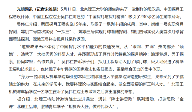 “身為一名即將從機車學院畢業的本科生和即將進入宇航學院深造的研究生,我感受到了宇航院士的魅力,在未來的學習中,我要將理論與實踐結合起來,做全面發展的新工科人才。”北理工機械與車輛學院一名學生在聽了吳偉仁院士思政課之后發出這樣的感想。