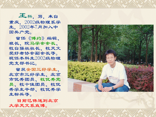 王科,2002級物理專業學生,典型的重慶小崽兒,熱情,干練,愛憎分明。來北理之前畢業于鼎鼎大名的重慶清華中學——這所中學的特點是很少有人考到清華大學:)在過去的三年中,曾任宿舍長,班長,課代表,學習委員,軍訓班長,院馬列主義學習會部長、會長,院刊《博約》編輯,校刊《北理人》編輯,校自強社社長,校天文愛好者協會副會長,校勤工助學中心干事,黨支部宣傳委員、支部書記等十四項、凡二十余次職務,不可思議的工作狂!學習上也不含糊,連續五次獲甲等人民獎學金,連續三次獲一等國家獎學金。看上去不壯,其實體育很強,尤善長跑。曾經數次奪得院運動會長跑項目的冠軍并打破記錄,也曾經因為拼的太厲害暈倒在校運動會的萬米跑道上。曾獲榮譽包括全國三好學生、北京市三好學生、北京市優秀團員、校優秀黨員、校十佳團員、校優秀學生干部、校優秀學生標兵等。目前已保送到夢寐以求的北京大學天文系直博。