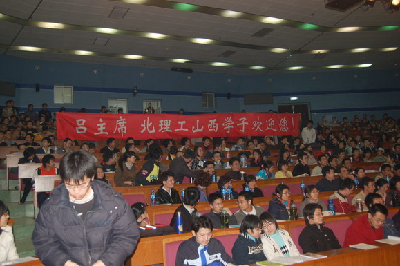 在北京理工大學學習的山西學子得知呂主席要來我校演講的消息后,在老鄉間相互轉告,并派代表早早的到來會場支持他們心目中的好領導。他們在會場打出了“呂主席,北理工山西學子歡迎您”的橫幅,并在講座開始前,選派代表為呂主席獻上了鮮花和他們事先準備好的禮物——一幅為呂主席書寫的對聯。上聯是“日月在心為國為民披肝膽”;下聯是“周身是口不爭不辯任去留?!庇靡员磉_山西學子對呂主席的敬意。
