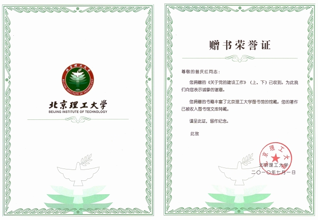 我校圖書館接受贈書并將此次贈書作為圖書館文庫特藏,同時向曾慶紅同志呈送了贈書榮譽證。