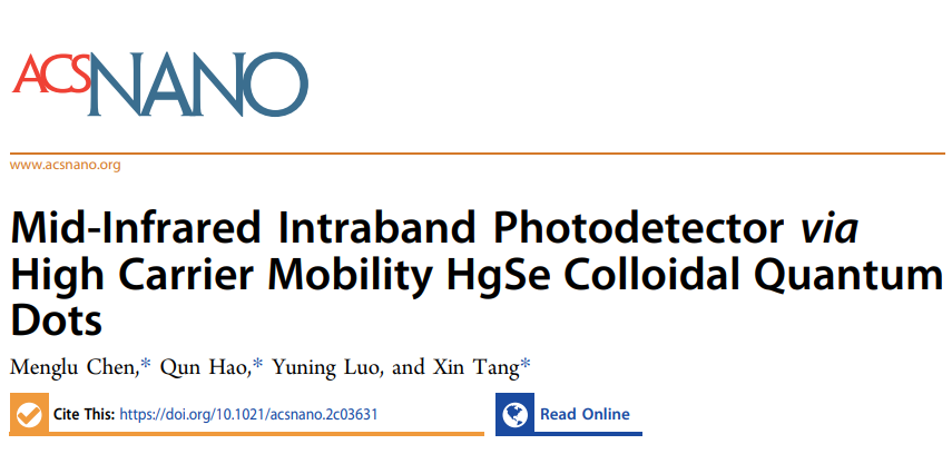 北京理工大學光電學院郝群教授團隊成員陳夢璐準聘教授、唐鑫教授在《ACS NANO》期刊上發表了題為“Mid-Infrared Intraband Photodetector via High Carrier Mobility HgSe Colloidal Quantum Dots”的文章,利用低成本膠體量子點導帶中1Se到1Pe的能級躍遷,實現低成本中波紅外帶內躍遷探測。