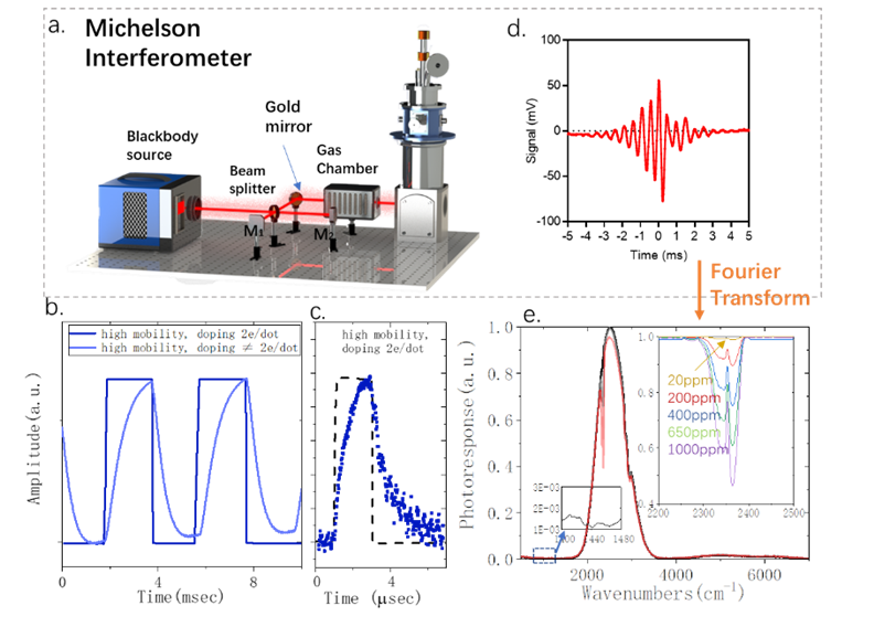 由此制備而成了膠體量子點帶內躍遷紅外相機,并成功實現熱成像(圖3)。與低遷移率的帶內躍遷膠體量子點探測器相比,該探測器響應度提升了55倍,比探測率提升了10倍至1.7×109 Jones。并且可以實現數微秒的快速響應(圖4)。其中波窄帶探測、響應速度快的特點,可以實現對溫室氣體的靈敏探測。以CO2為例,結合邁克爾遜干涉儀, 本文成功結合實現了探測精度0.25 ppm至2000 ppm的CO2氣體傳感器。