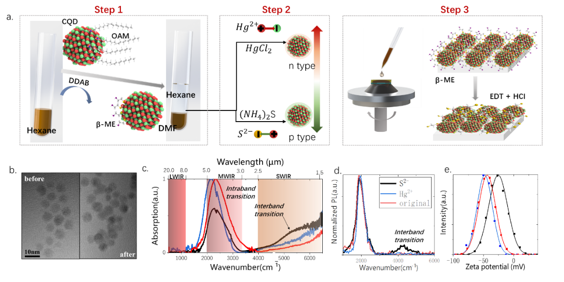 帶內躍遷紅外材料體系,對摻雜精確調控和載流子輸運控制提出了更高的要求。該工作開發了帶內躍遷膠體量子點混相配體交換方法(圖1),可以有效減小量子點之間的間距,實現表面偶極子摻雜精確調控,并且使得材料在空氣環境下穩定。并且搭建了光譜電化學平臺(圖2),獲得精確的HgSe膠體量子點能帶結構,證明材料中無明顯缺陷態。