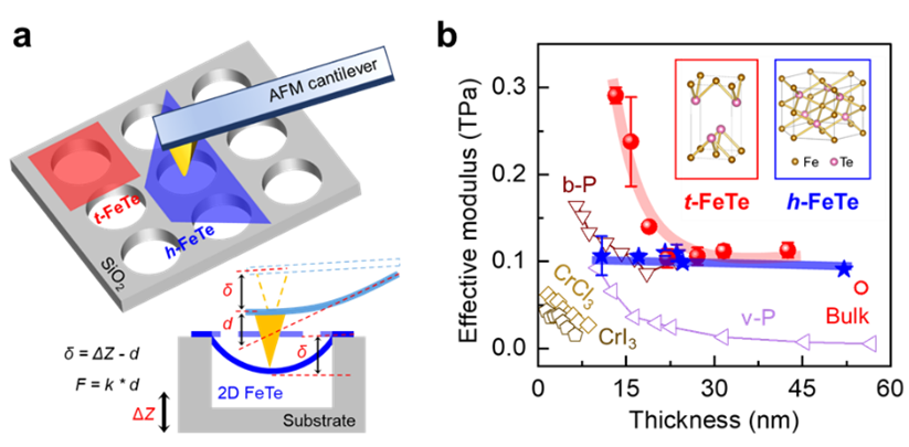 利用基于原子力顯微鏡的納米壓痕法,課題組成員在硅基懸空基底上探究了二維FeTe材料的楊氏模量(圖3)。測試結(jié)果表明,四方相FeTe 的楊氏模量隨著厚度增加而降低,在 13.2 nm 時(shí),楊氏模量達(dá)到 290.9±9.2 GPa,在 22.0 nm 時(shí),楊氏模量減小為 103.6±11.0 GPa,隨著納米片的厚度繼續(xù)增加,楊氏模量基本保持不變。相反地,六方相FeTe 的楊氏模量隨著納米片的厚度變化不發(fā)生改變。對比分析發(fā)現(xiàn),四方FeTe 納米片的楊氏模量要大于六方FeTe 納米片的楊氏模量。
