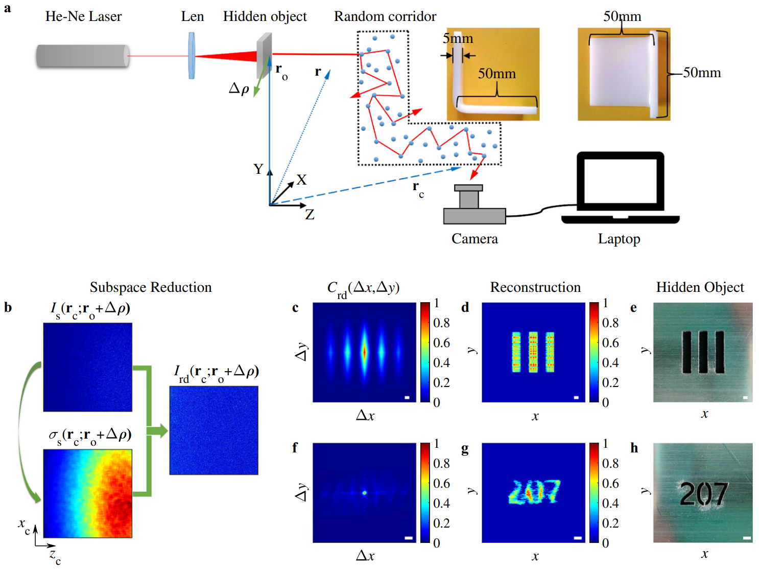 圖1 成像位于隨機走廊一個拐角后的隱藏目標。a 實驗成像系統原理圖。b 激光散斑光強照片子空間約化示意圖。c,f 散斑光強關聯函數。d,g 重建出的隱藏目標圖像。e,h 隱藏目標實物照片。