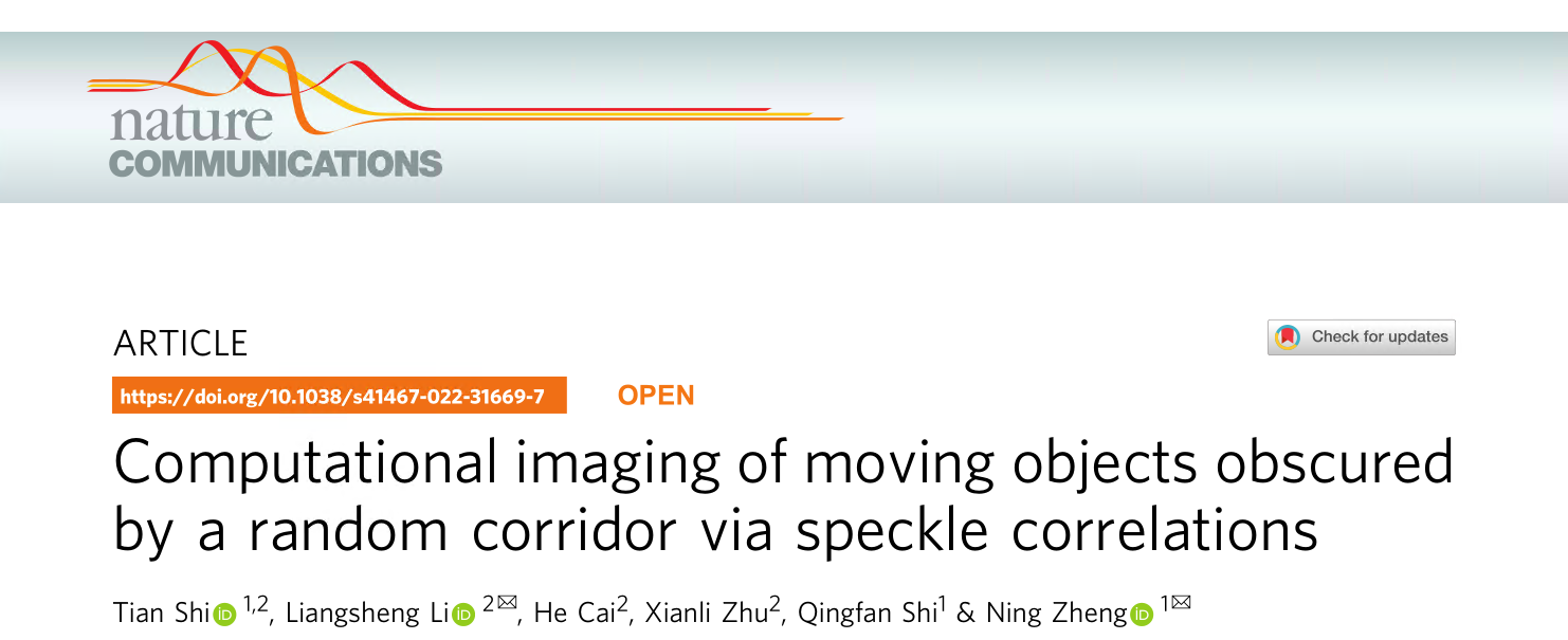 近日,北京理工大學物理學院鄭寧教授團隊和北京環境特性研究所的李糧生研究員團隊,在《Nature Communications》發表題為 “Computational imaging of moving objects obscured by a random corridor via speckle correlations” 的文章。團隊提出了一種新型的散斑關聯方法,實現了對隨機走廊(包含隨機介質的曲折走廊)中隱藏目標的成像,同時定量分析了該方法的成像適用范圍。北京理工大學的博士研究生石天為論文的第一作者,鄭寧教授和李糧生研究員為論文的共同通訊作者。論文的合作者包括北京理工大學的史慶藩教授,北京環境特性研究所的工作人員蔡禾和朱先立。