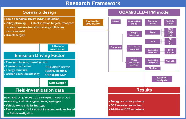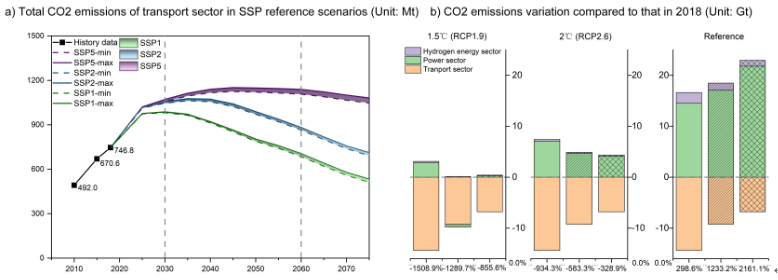 電能替代,即“以電代煤、以電代油、以電代氣”,是我國減少CO2等溫室氣體排放的關鍵抓手和重要政策。然而,電能替代能否真正實現CO2的減排嚴重依賴于電力結構的清潔化程度;否則,推行電能替代政策可能會造成更多的CO2排放,導致“電氣化程度越高,CO2排放越多”的現象。為此,王兆華教授團隊自主研發了基于政策導向的SEED-TPM交通部門電能替代模型,采集并制備了多部門電能替代技術詳細參數。同時,團隊將SEED-TPM模型與國際上權威的GCAM模型進行耦合,將SSP(Shared Socio-economic Pathways)情景與中國化電能替代政策指標和技術參數相結合,構建中國化電能替代SSP情景,并以交通部門為例探究了所有各交通部門不同電氣化水平帶來的直接減排效果和跨部門間接排放影響。