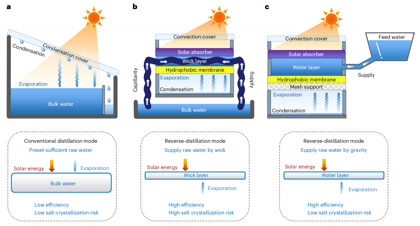 圖1. 太陽能驅動的蒸餾模式 (a)傳統蒸餾;(b)基于親水材料的逆向蒸餾;(c)基于水層的逆向蒸餾