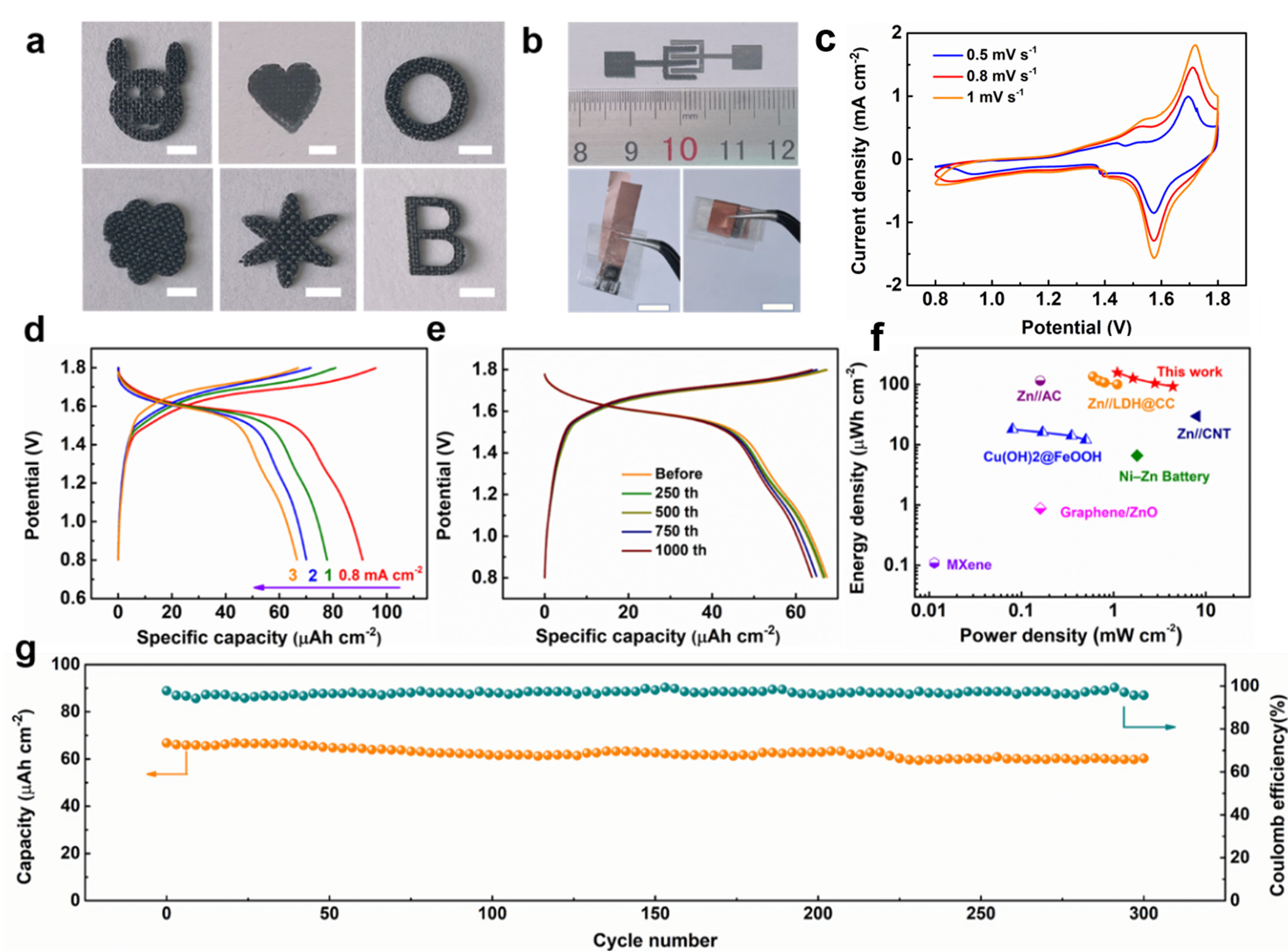 除了快速和大規模生產的優點外,制備的NiCoLDH@CC還顯示出突出的機械穩定性、靈活性和可加工性,可任意切割成各種圖案(圖6a),顯示出在下一代新興能源設備中的潛力。例如,芯片上的微電源(例如,微型電池、微型超級電容器)由于其高能量密度和集成到微型設備的巨大可行性,近年來引起了極大的關注,這是智能醫療植入物、人工智能機器人和其他自供電微系統開發所必需的。為此,可以通過激光切割定制叉指電極圖案。如圖所示,6b,基于叉指式NiCo構建了柔性準固態片上堿性水性NiCo-Zn微電池(NC-ZMB,基于整個器件,面積約為0.6 cm-2)LDH@CC微電極、鋅板微電極和PVA-KOH凝膠電解質。值得注意的是,NC-ZMB顯示出顯著的靈活性,如彎曲和旋轉(圖6b)。圖6c-g為微電池的電化學性能圖,其中最大面積比容量達到92μAh cm-2。