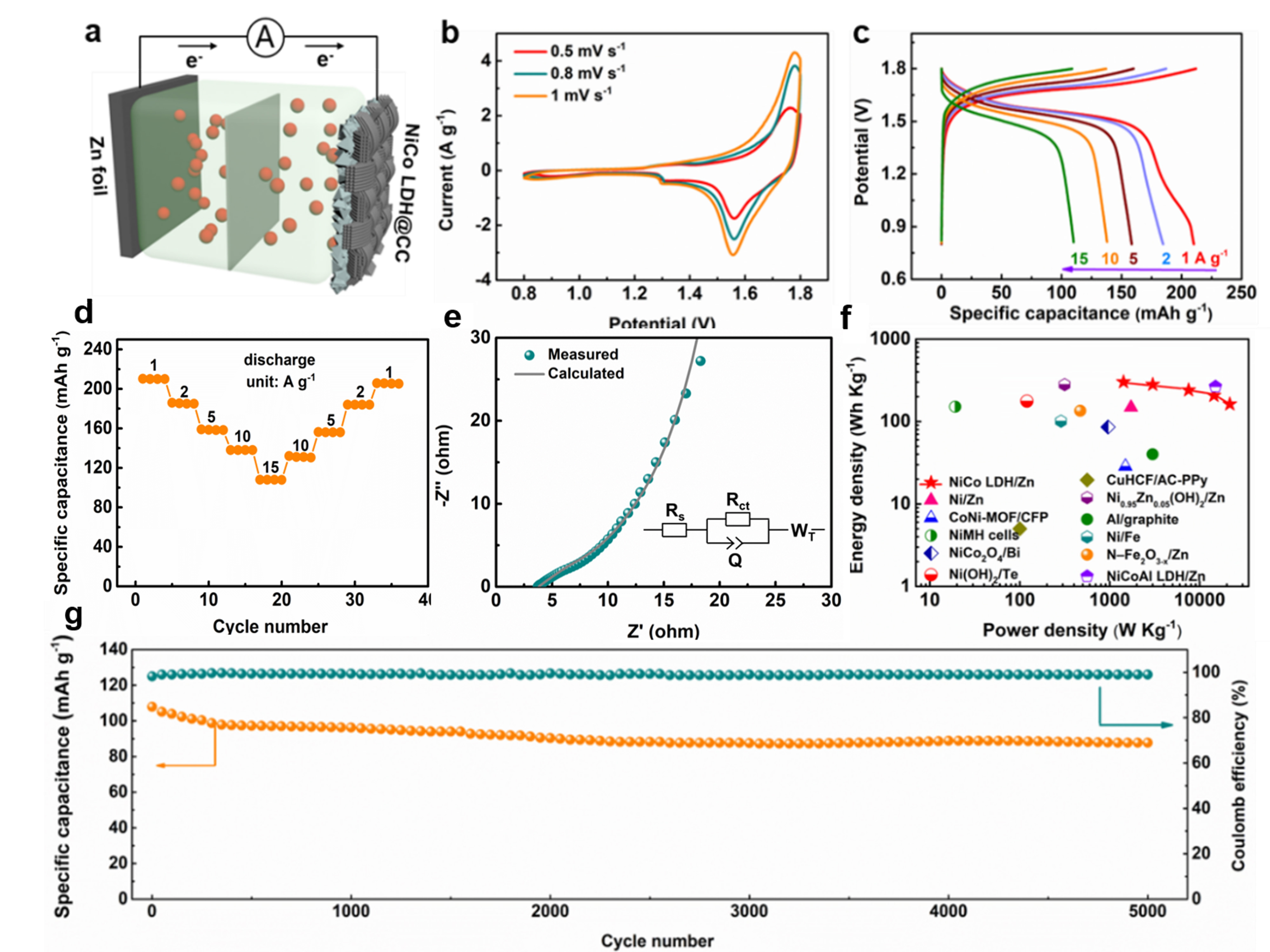 基于上述考慮,以NiCo LDH@CC為正極材料,Zn箔為負極材料,1.0 M KOH為電解液,研究了堿性水系鋅電池的電化學性能(圖5a )。圖5b, c為電池的CV曲線和充放電曲線,根據充放電曲線所計算出電池在1.0 A g-1下的比容量為211.2 mAh g-1,在15 A g-1下電容保持在108 mAh g-1(圖5d)。器件的奈奎斯特曲線如圖5e所示,相應的等效電路如插圖所示。圖5f為與之前報道的大多數水系鋅電池和其他水系儲能器件的性能對比圖,可以看出我們所組裝的電池的能量密度具有較大優勢。圖5g為電池在15 A g-1下的循環性能圖,在5000圈后能夠保持81.4%的電容。