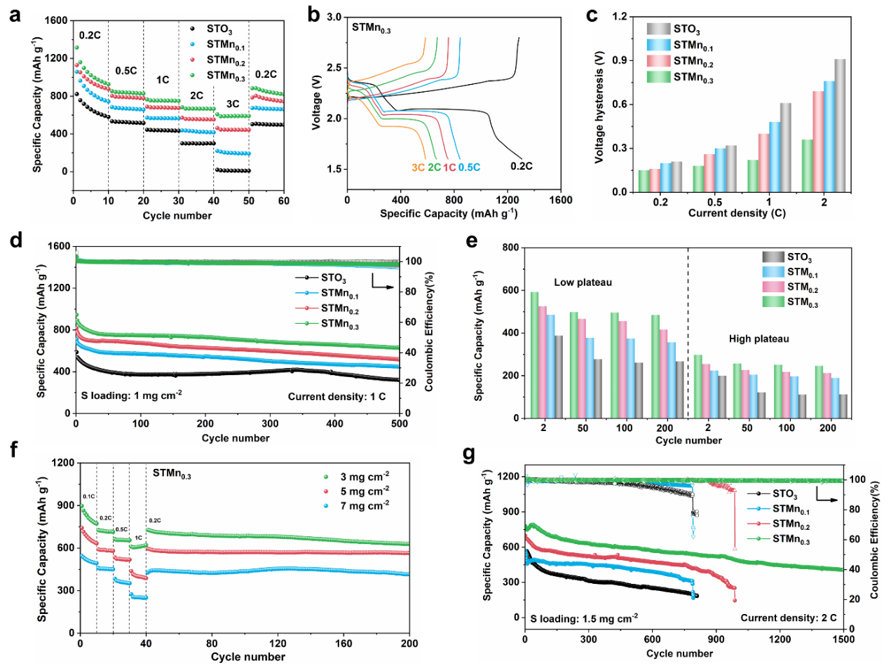 在國家自然科學基金委的支持下,我校化學與化工學院王振華教授和孫克寧教授團隊在前期的研究基礎上,基于缺陷化學理論,選擇具有吸附性能和電化學穩定性的鈦酸鍶基鈣鈦礦氧化物作為基底材料,對鈦酸鍶基鈣鈦礦氧化物Sr0.9Ti1-xMnxO3-δ (STMnx) (x="0.1-0.3)進行了氧空位濃度的調控,改善其吸附-催化性能,實現了高性能鋰硫電池。以具有較高氧空位濃度的STMn0.3作為正極載體的鋰硫電池,在2C下進行1500次循環后仍可提供780 mAh g-1的高初始比容量和0.032%的低衰減率。這種氧空位的定量調控策略對缺陷材料的設計與調控具有啟發意義,可在鋰硫電池及相關儲能與轉換系統領域推廣應用。