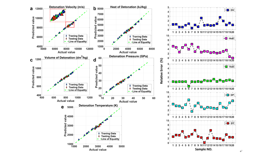同時研究中發現在羽流膨脹和等離子體冷卻過程中,振動態玻爾茲曼分布對應溫度并非一直降低,而是在特定時間延遲下短暫恒定,如圖3所示。這是由于含能材料放熱物理化學反應放出的額外熱量補償了等離子體溫度的持續衰變。因此,以特定延時下采集的高速動態圖像作為輸入數據,結合特征提取和線性SVR算法,建立了基于時間分辨圖像及光譜的含能材料五爆參數(爆速、爆熱、爆容、爆壓、爆溫)定量分析的機器學習模型,進而完成了27種含能材料的爆轟性能高精度預測,預測模型的平均預測誤差均小于5%,如圖4所示。該工作為含能材料爆轟性能的快速測試提供了一種低成本、高精度、高安全性、高通量的新原理、新方法、新思路,相比于高成本、高風險、低重復精度的傳統宏觀測試方法,優勢顯著。該成果發表在國際權威期刊J Materials Chemistry A( 2022,10,13114-13123)上。