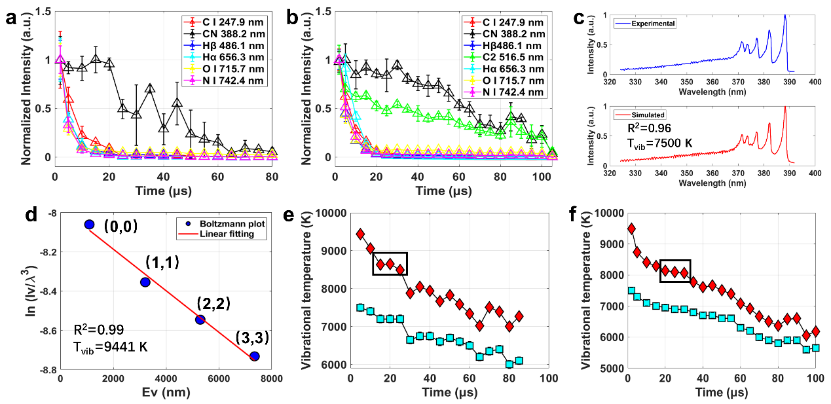 圖3 時間分辨光譜結果:(a)傳統高能含能材料光譜強度隨時間演化;(b)唑類含能材料光譜強度隨時間演化;(c)分子峰實驗測試與模擬圖對比;(d)玻爾茲曼平面圖;(e)傳統高能含能材料振動溫度隨時間演化;(f)唑類含能材料振動溫度隨時間演化