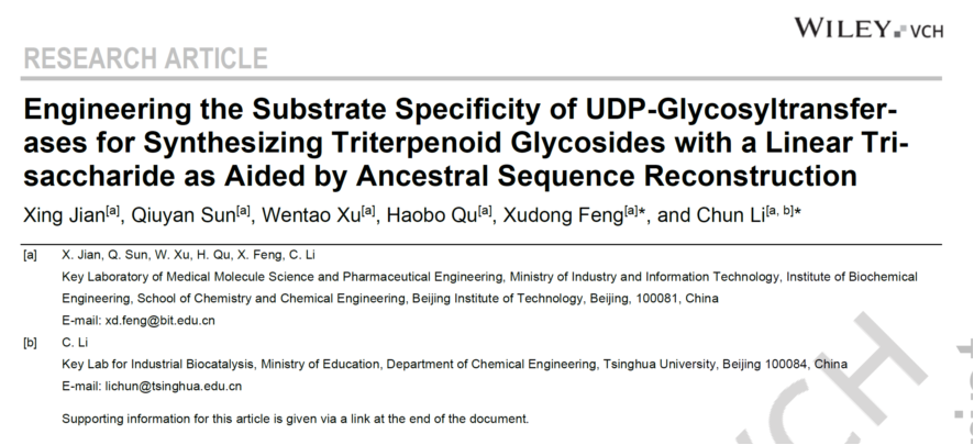 編輯:田柳 審核:王振華 閱讀次數:三萜化合物是一類重要的植物天然產物,因其獨特的藥理活性而受到廣泛關注。然而,由于分子中的疏水碳環結構,三萜化合物普遍存在溶解度低和生物利用度差的問題。糖基修飾可顯著改善三萜化合物的水溶性,因此三萜化合物多以糖苷的形式存在。其中,直鏈三糖基修飾是一種重要的糖基修飾類型,對發揮三萜化合物獨特的藥理活性具有重要意義。相較于化學合成法,利用酶法合成三萜糖苷化合物具有反應條件溫和、定向催化和環境友好等優勢,特別是在合成具有復雜多糖基修飾的三萜糖苷化合物時,酶法可避免化學合成法中繁雜的基團保護與去保護過程。尿苷二磷酸-糖基轉移酶(uridine diphosphate glycosyltransferases,UGTs)是催化天然產物糖基修飾的主要生物催化劑,在目前已報道的UGTs中,大多僅催化三萜單糖苷和二糖苷的合成,具有直鏈三糖基修飾催化活性的UGTs數量極少,限制了三萜直鏈三糖苷的酶法合成。此外,該類型UGTs的催化功能特點和底物特異性的分子機制也不清晰。針對以上問題,本研究通過生物信息學分析、結合體外酶學性質表征系統發掘可催化合成三萜直鏈三糖苷的UGTs,并揭示該類型UGTs催化底物的結構特點,通過祖先酶序列重構、氨基酸突變和計算機模擬等手段闡明其底物特異性的分子機制。相關研究成果以“Engineering the Substrate Specificity of UDP-Glycosyltransferases for Synthesizing Triterpenoid Glycosides with a Linear Trisaccharide as Aided by Ancestral Sequence Reconstruction”為題目在國際知名期刊Angewante Chemie International Edition上發表(DOI: /10.1002/anie.202409867)。北京理工大學化學與化工學院博士研究生簡行為該論文的第一作者,清華大學李春教授與北京理工大學化學與化工學院長聘副教授馮旭東為該論文的共同通訊作者。