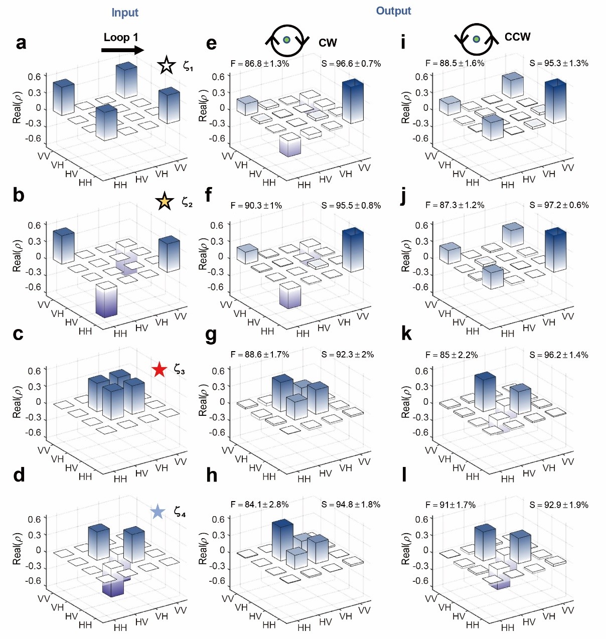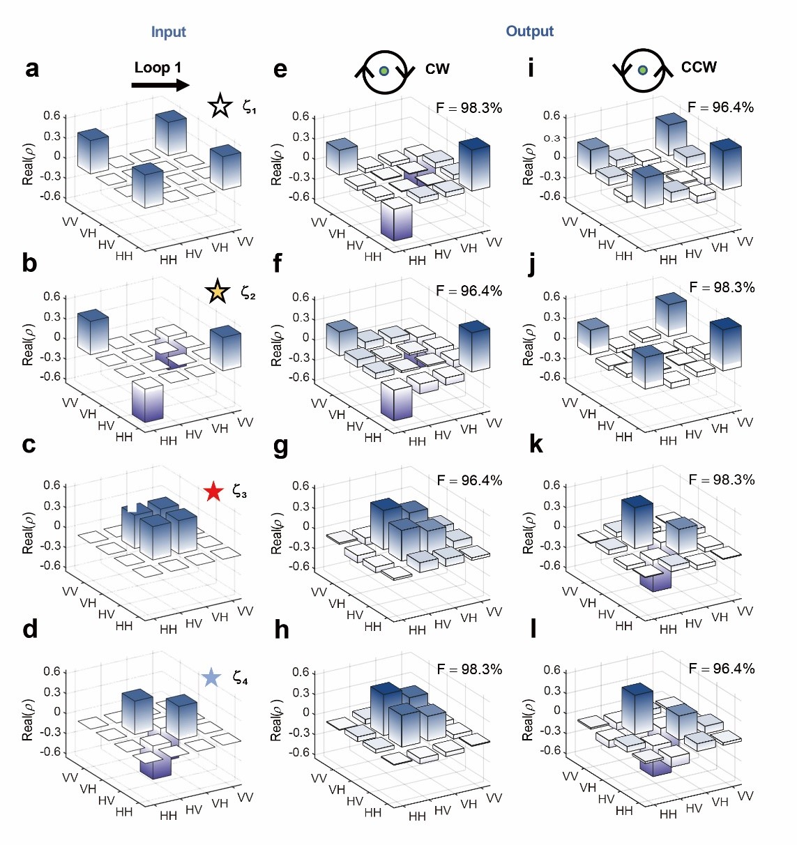 四個輸出態的理論密度矩陣如圖 2 所示。圖 2e-2h 對應的是順時針變化的情況,而圖 2i-2l 對應的是逆時針變化的情況。為便于比較,圖 2a-2d 顯示了輸入狀態的密度矩陣。圖 2a-2d 中的白色、黃色、紅色和藍色星號與圖 1b 中標注的星號相對應,分別代表輸入態,
