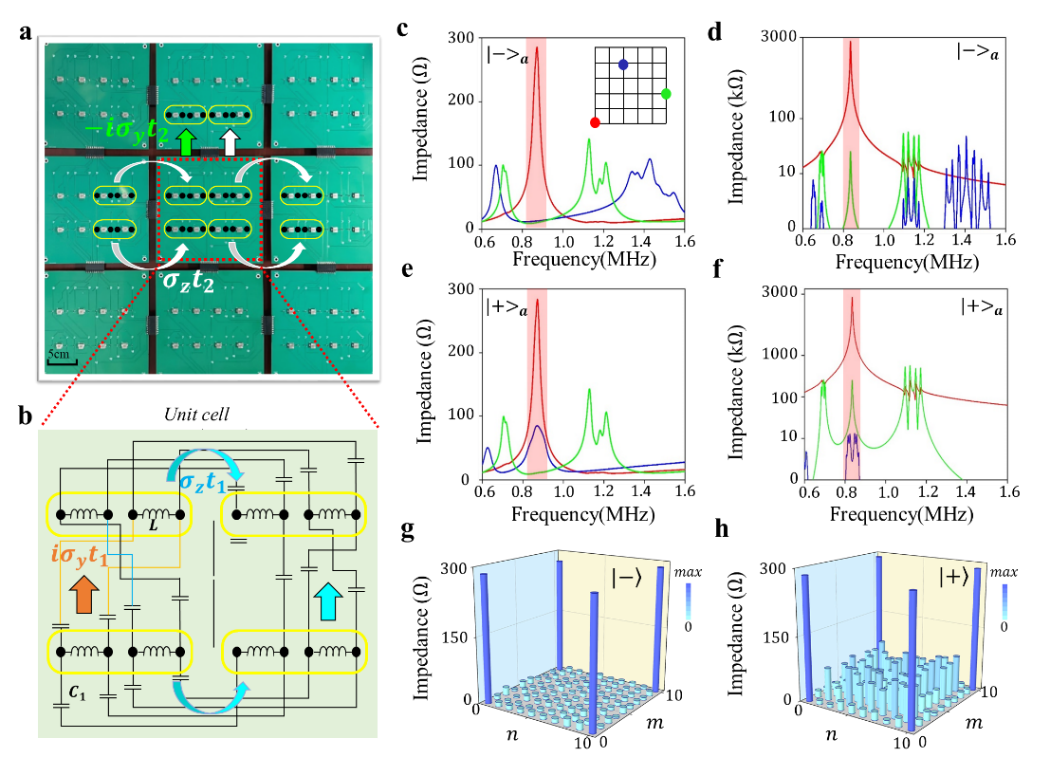研究人員通過(guò)設(shè)計(jì)拓?fù)潆娐穪?lái)觀察非阿貝爾拓?fù)溥B續(xù)譜束縛態(tài)。圖2a為電路板樣品的照片示意圖,不同顏色的箭頭表示格點(diǎn)之間的不同耦合矩陣。單個(gè)元胞的電路結(jié)構(gòu)示意圖如圖2b所示。研究人員將具有內(nèi)部贗自旋的單個(gè)子格點(diǎn)映射到黃色框中的四個(gè)電路節(jié)點(diǎn),通過(guò)阻抗測(cè)量可以探究不同子空間的能譜特性,如圖2c和2e所示。紅色、綠色和藍(lán)色線分別對(duì)應(yīng)角點(diǎn)、邊點(diǎn)和體點(diǎn)的阻抗響應(yīng)。結(jié)果表明角點(diǎn)處的阻抗峰值遠(yuǎn)大于邊點(diǎn)和體點(diǎn),且該峰值頻率與非阿貝爾高階拓?fù)溥B續(xù)譜束縛態(tài)能量完美對(duì)應(yīng)。實(shí)驗(yàn)結(jié)果與圖2d和2f的電路仿真阻抗響應(yīng)也具有良好的一致性。研究人員進(jìn)一步測(cè)量了兩個(gè)子空間中拓?fù)溥B續(xù)譜束縛態(tài)對(duì)應(yīng)頻率處的電路阻抗分布,如圖2g和2h所示。兩個(gè)子空間的電路阻抗都在四個(gè)角點(diǎn)呈現(xiàn)局域化特性。其中一個(gè)子空間的體節(jié)點(diǎn)也具有明顯的阻抗響應(yīng),但該子空間的角點(diǎn)阻抗值仍與另一子空間相同,表明平庸體態(tài)和拓?fù)浣菓B(tài)的解耦共存現(xiàn)象。實(shí)驗(yàn)結(jié)果清楚證明了非阿貝爾拓?fù)溥B續(xù)譜束縛態(tài)的存在。