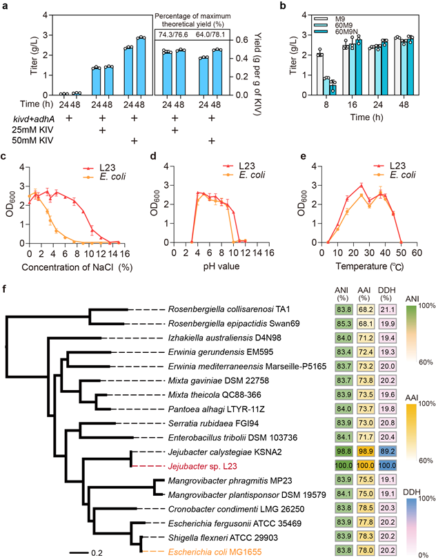 本研究從超級蠕蟲Zophobas atratus腸道中分離出一株耐鹽腸道微生物,并鑒定該菌株為濟州桿菌Jejubacter sp. L23。L23菌株為革蘭氏陰性菌,細胞呈桿狀,兼性厭氧,能夠在0~12%(w/v)NaCl,10~45℃,以及pH4.0~10.0的條件下生長。并且與大腸桿菌具有高度的生理生化及遺傳相似性。通過對該菌株進行系統研究,開發了一系列代謝工程改造相關的基因元件、遺傳操作方法和基因編輯工具等。以α-酮異戊酸為底物,L23菌株在低鹽滅菌、高鹽滅菌以及非滅菌的條件下均可高效生產異丁醇。初步證明了濟州桿菌非滅菌發酵生產異丁醇的可能性(圖2)。