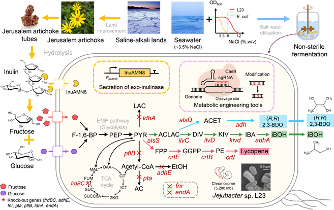 傳統工業生物技術依賴于農業原材料和高溫滅菌的生物過程來生產大宗化學品。該技術仍存在一些亟需解決的問題,例如,原材料成本價格高、滅菌過程繁瑣且能耗大、微生物污染頻繁、產品轉化效率低下、發酵設備昂貴、大量消耗淡水等。下一代工業生物技術可以基于極端微生物,比如嗜鹽菌,在開放的非滅菌環境下發酵生產,并使用可再生資源的原料來進行低成本的綠色生物制造。因此,霍毅欣團隊首次開發了一種類似大腸桿菌的易于工程改造的新型耐鹽微生物平臺,濟州桿菌 Jejubacter sp. L23。并通過生物合成途徑和宿主代謝途徑等多方面工程改造,成功實現了以濟州桿菌為宿主,利用非糧生物質菊粉為底物,進行非滅菌發酵生產多種大宗化學品,如異丁醇、( R , R )-2,3-丁二醇和番茄紅素(圖1)。