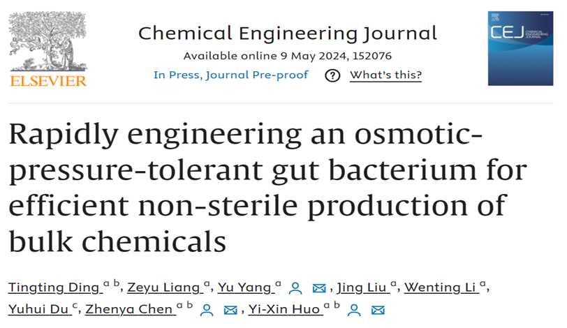 編輯:肖雯 審核:周連景 閱讀次數:近日,北京理工大學霍毅欣教授團隊在改造耐鹽濟州桿菌實現非滅菌發酵生產方面取得重要進展。相關研究成果以“Rapidly engineering an osmotic-pressure-tolerant gut bacterium for efficient non-sterile production of bulk chemicals”為題,在頂級期刊《Chemical Engineering Journal》(影響因子:15.1)上發表(doi.org/10.1016/j.cej.2024.152076)。