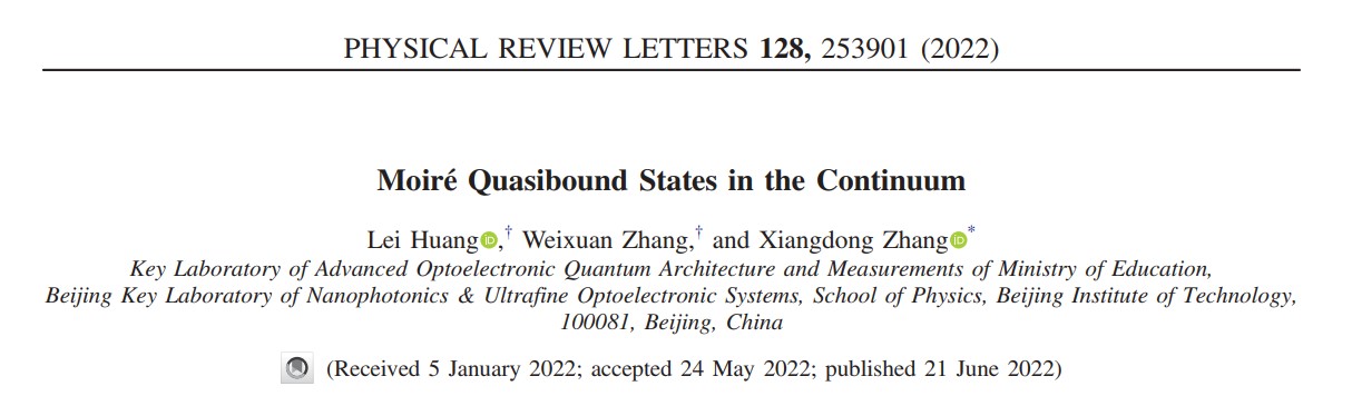 編輯:王莉蓉 審核:姜艷 閱讀次數:日前,北京理工大學物理學院張向東教授課題組,在基于moiré光子晶體板的連續譜束縛態研究方面取得重要進展。相關研究成果發表在近期的Phy. Rev. Lett. (128, 253902 (2022))上。研究工作得到了國家自然科學基金委和國家重點研發計劃的資助。北京理工大學物理學院黃磊博士(2021級)和張蔚暄博士(現集成電路與電子學院特立博士后)為論文的共同第一作者。