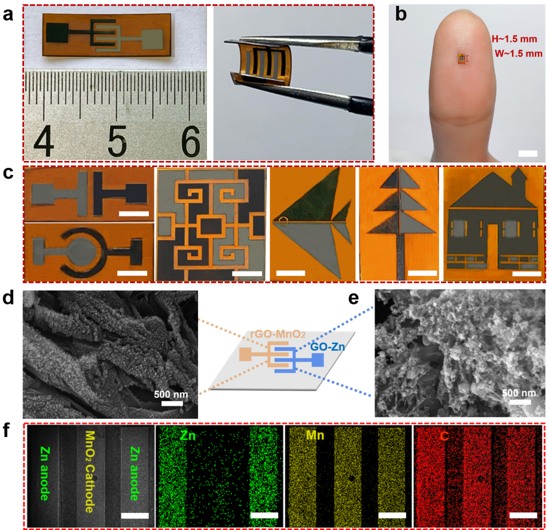 單個微電池的總體尺寸約為0.6 cm2。觀察到即使在彎曲狀態下,微電池也能保持其結構完整性而不會從基材上脫落,顯示出良好的柔韌性。由于激光的高精度,微電池的最小單位面積可達到~2.3 mm2 (~1.5 mm寬,~1.5 mm高),單個手指寬度和電極間隙僅為~160 μm和~100 μm。此外,它還可以實現任意幾何形狀的直接無掩模微圖案制備。掃描電鏡照片和mapping圖像進一步證明了微電極的成功構筑。